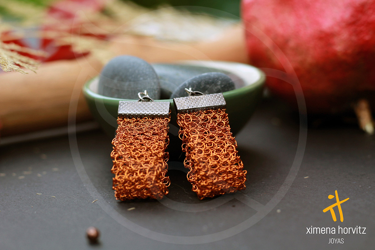 Aros tejidos a mano con hilo de cobre esmaltado en color natural y ganchos de acero quirúrgico. Tiempo mínimo de entrega 48 horas. Ximena Horvitz WSP +56 9 9434 9014