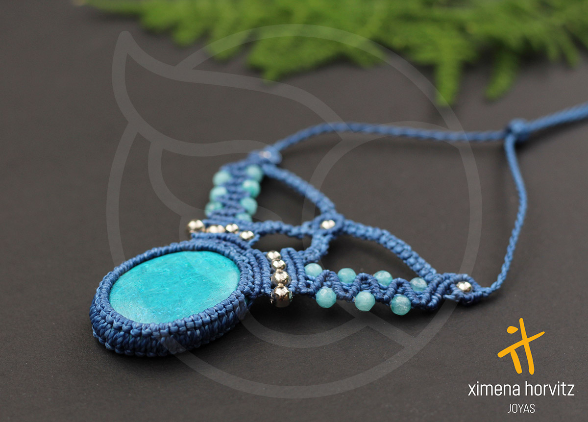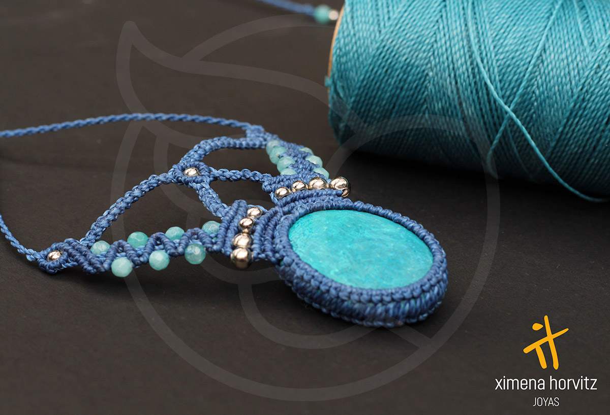Collar ajustable tejido en macramé con una piedra de mar pintada, ágatas y cuentas de latón plateadas. Tiempo mínimo de entrega 48 horas. Ximena Horvitz WSP +56 9 9434 9014