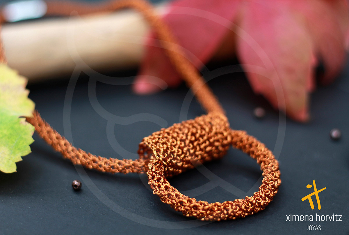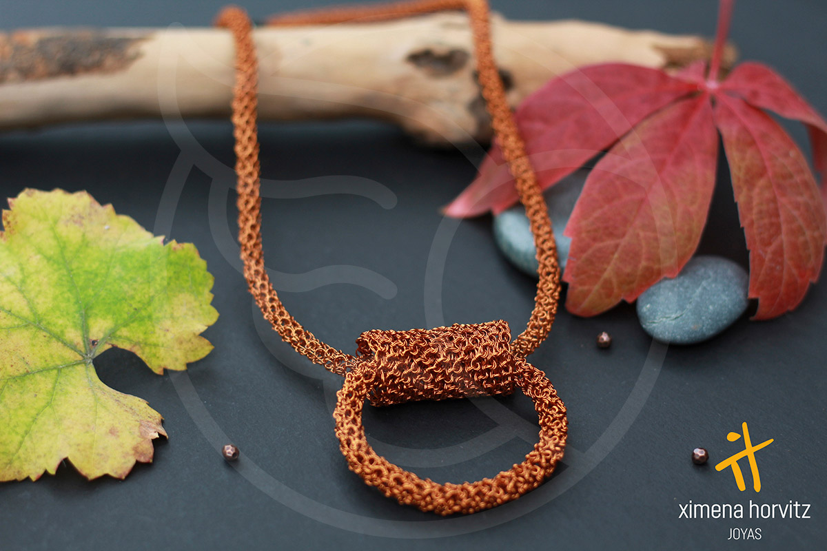 Collar tejido a mano con hilo de cobre esmaltado en color natural. Tiempo mínimo de entrega 48 horas. Ximena Horvitz WSP +56 9 9434 9014