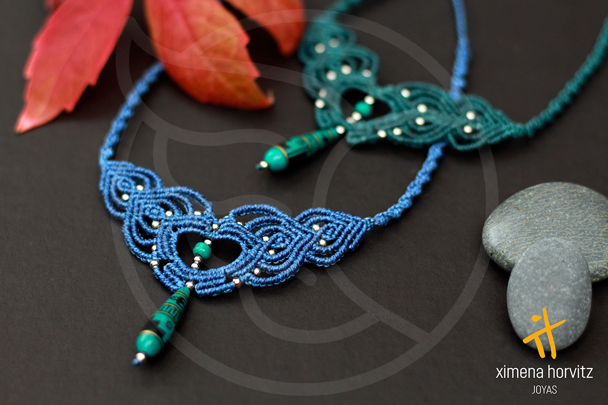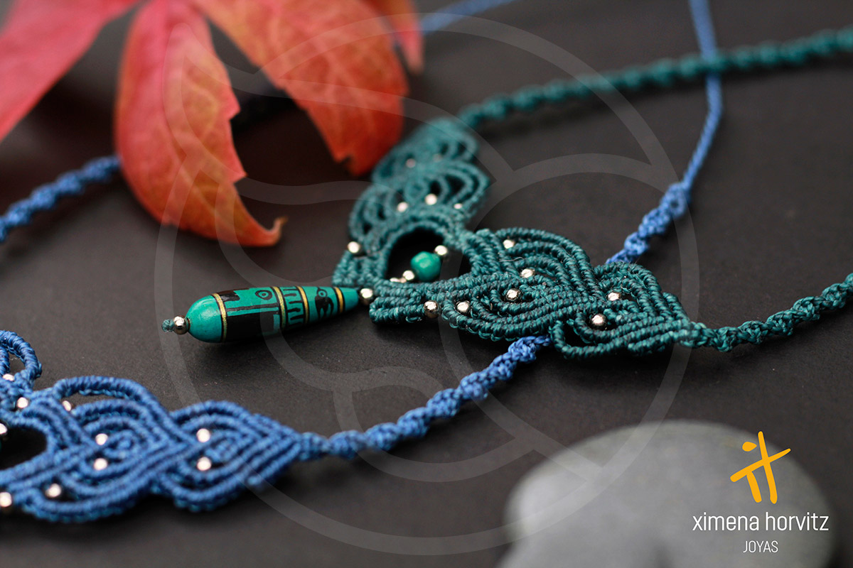Collar ajustable tejido en macramé con cuentas de madera dibujada y latón. Tiempo mínimo de entrega 48 horas. Ximena Horvitz WSP +56 9 9434 9014