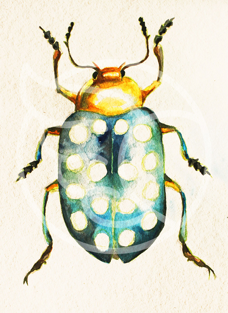Acuarela Escarabajo Azul , imagen 12 cm ancho x 14 cm alto, Sin Enmarcar (medidas consideran sólo la imagen). Adriana Mercado WSP +56 9 6645 2241
